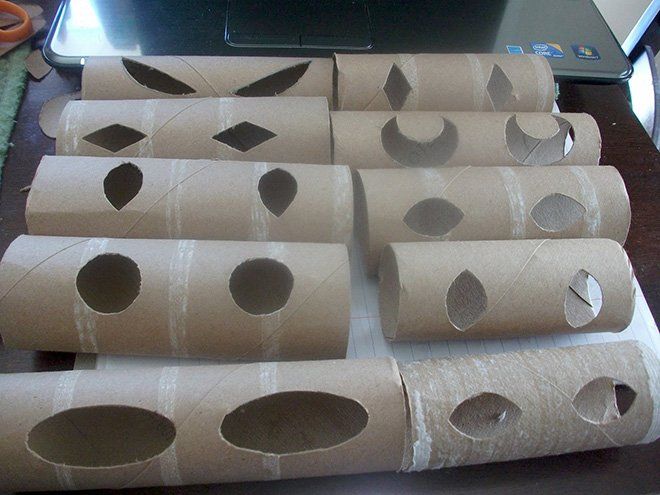 Fácil y sencillo para toda la familia con el tubo de papel higiénico papel de celofán rojo y una minilinterna, si tienes jardín puede ser una buena decoración para colocar en los arbustos y si no en las ventanas también atemorizaran a quien los vea…