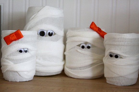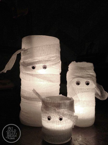 Mis favoritas! las velas momia que puedes hacer con velas, venda y ojos o con velas pequeñas metidas en tarros de cristal cubiertos de venda…